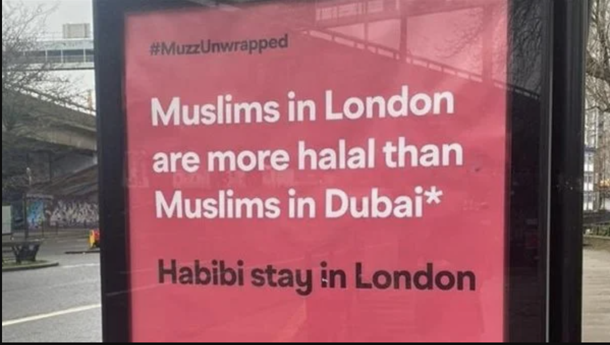 وتضمنت اللافتات جملاً مثل "مسلمو بريطانيا يتبعون الحلال أكثر من مسلمي دبي"، وأشارت الحملة الإعلانية إلى أن هذا الاعتقاد يرجع إلى أن مسلمي بريطانيا يراقبون بشكل أكبر عاداتهم اليومية، وطبيعة أكلهم الحلال والشرب والاستمتاع وما إلى ذلك.