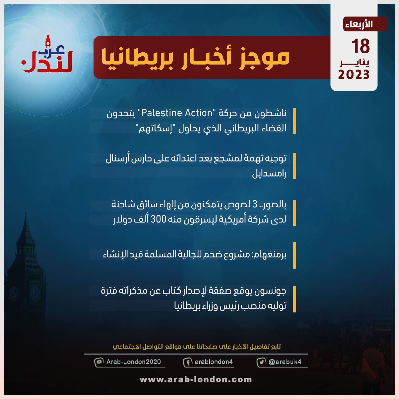 الرئيسية أخبار موجز أخبار بريطانيا الأربعاء: 18 كانون الثاني 2023 أخبار موجز أخبار بريطانيا الأربعاء: 18 كانون الثاني 2023 2023-01-18 ناشطون من حركة "Palestine Action" يتحدون القضاء البريطاني الذي يحاول "إسكاتهم" توجيه تهمة لمشجع بعد اعتدائه على حارس أرسنال رامسدايل بالصور.. 3 لصوص يتمكنون من إلهاء سائق شاحنة لدى شركة أمريكية ليسرقون منه 300ألف دولار رمنغهام: مشروع ضخم للجالية المسلمة قيد الإنشاء جونسون يوقع صفقة لإصدار كتاب عن مذكراته فترة توليه منصب رئيس وزراء بريطانيا السابق كنيسة إنكلترا مستعدة لمباركة عقود الاتحاد بين المثليين من دون تزويجهم التالي المجلس الإسلامي البريطاني: "لمصلحة بريطانيا يجب أن نطلق العنان لإمكانات المجتمع المدني الإسلامي" تابعوا آخر أخبار عرب لندن عبر Google News الاكثر قراءة الديلي ميل: دبي انتهت والناس يفرون منها !! 2026-03-12 مساجد بريطانيا تعلن الجمعة أول أيام عيد الفطر 2026-03-18 لندن تدرس فرض رسوم إضافية على سيارات الدفع الرباعي للحد من حوادث الطرق 2026-03-13 أمسية حوارية على منصة عرب لندن بعنوان “زلزال قوانين الهجرة البريطانية” 2026-03-14 هل تحولت السياسة الأمريكية إلى حرب صليبية على إيران بقيادة وزير الدفاع الأمريكي؟ 2026-03-12 وفاتان في بريطانيا بمرض التهاب السحايا: ما هو وما أعراضه وكيف تحمي نفسك؟ 2026-03-17 مقالات ذات صلة موجز أخبار بريطانيا من منصة عرب لندن: الخميس: 18 مارس/آذار 2026 2026-03-19 عاجل: قفزة هائلة في أسعار الغاز العالمية بعد ضربة إيرانية لمنشأة "رأس لفان" القطرية 2026-03-19 بريطانيا في دقيقة: مهندس بريطاني يبني ملجأ نوويا تحت الأرض لحماية عائلته من الحرب النووية!! 2026-03-19 ستارمر يطالب بإقالة وزير عدل "الظل" بعد وصفه صلاة المسلمين بـ "فعل هيمنة" 2026-03-19 مليون إسترليني من أموال الضرائب لتطبيقات "استرخاء" لموظفي الحكومة والجيش في بريطانيا 2026-03-19