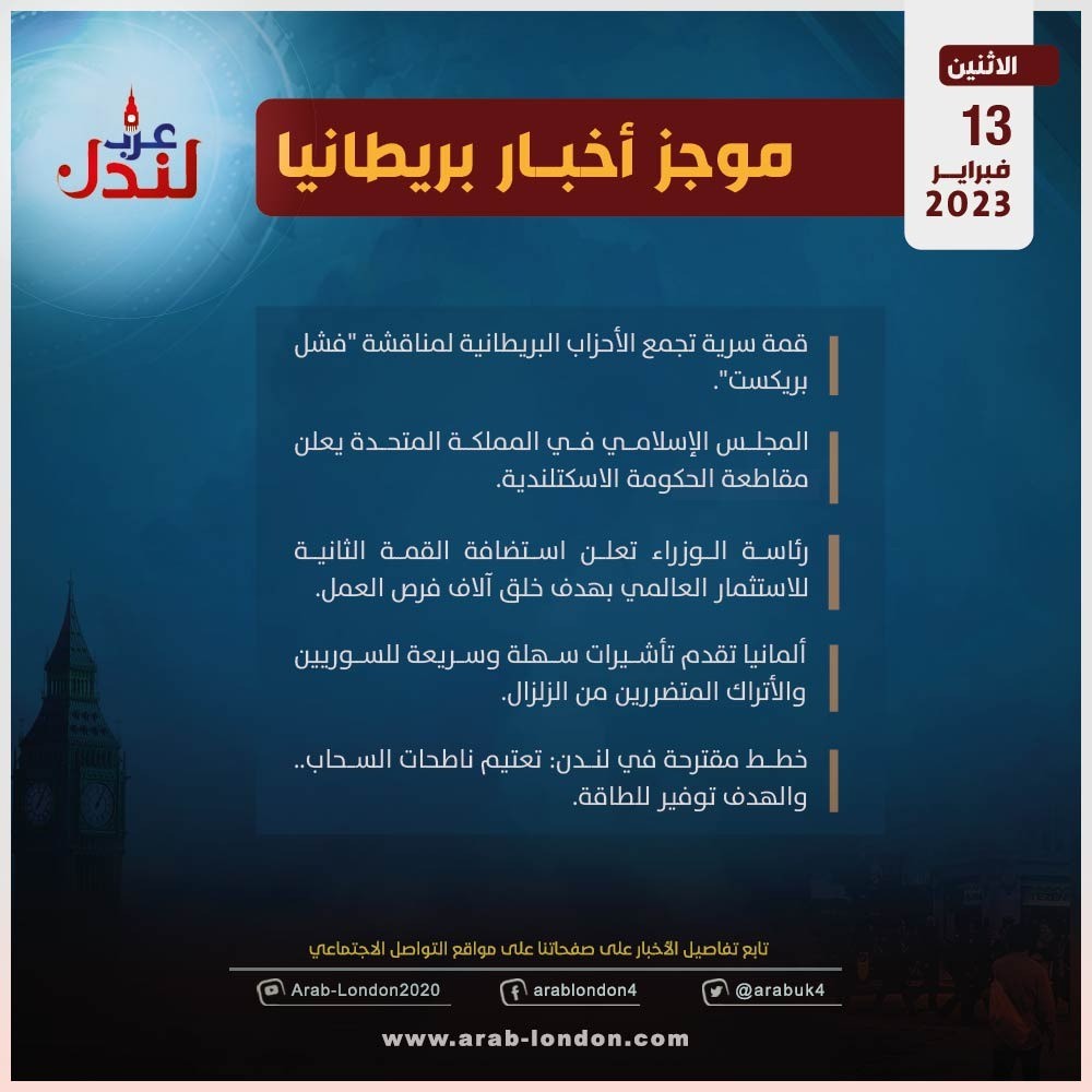 الرئيسية أخبار موجز أخبار بريطانيا: 13 فبراير / شباط 2023 أخبار موجز أخبار بريطانيا: 13 فبراير / شباط 2023 2023-02-13 السابق فيديو يحبس الأنفاس لفريق إنقاذ بريطاني يحفر نفقاً طويلاً للوصول لتركي عالق تحت الأنقاض التالي قمة سرية تجمع الأحزاب البريطانية لمناقشة "فشل بريكست" تابعوا آخر أخبار عرب لندن عبر Google News الاكثر قراءة مساجد بريطانيا تعلن الجمعة أول أيام عيد الفطر 2026-03-18 أمسية حوارية على منصة عرب لندن بعنوان “زلزال قوانين الهجرة البريطانية” 2026-03-14 لندن تدرس فرض رسوم إضافية على سيارات الدفع الرباعي للحد من حوادث الطرق 2026-03-13 هل تحولت السياسة الأمريكية إلى حرب صليبية على إيران بقيادة وزير الدفاع الأمريكي؟ 2026-03-12 وفاتان في بريطانيا بمرض التهاب السحايا: ما هو وما أعراضه وكيف تحمي نفسك؟ 2026-03-17 عاجل| بسبب تبييض جرائم الحرب في السودان.. شبكة "سكاي نيوز" تنهي شراكتها مع الإمارات 2026-03-18 مقالات ذات صلة تفشي التهاب السحايا في كينت: NHS تُلزم الطاقم الطبي بارتداء الكمامات 2026-03-19 ستارمر يتحرك لاحتواء تمرد داخل حزب العمال عبر استثناءات في نظام الهجرة 2026-03-19 زيارة مرتقبة لـالملك تشارلز الثالث إلى واشنطن وسط خلافات مع ترامب بشأن إيران 2026-03-19 موجز أخبار بريطانيا من منصة عرب لندن: الخميس: 18 مارس/آذار 2026 2026-03-19 عاجل: قفزة هائلة في أسعار الغاز العالمية بعد ضربة إيرانية لمنشأة "رأس لفان" القطرية 2026-03-19