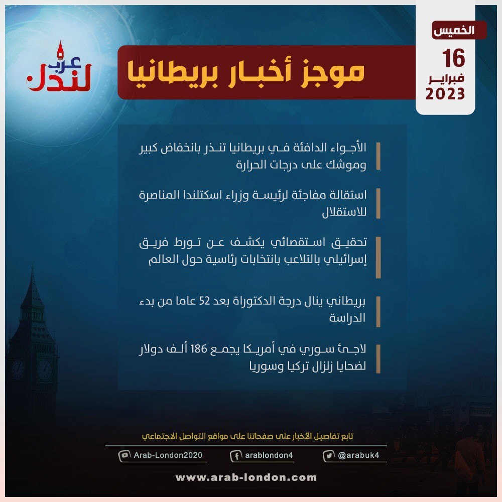 الرئيسية أخبار موجز أخبار بريطانيا: 16 فبراير / شباط 2023 أخبار موجز أخبار بريطانيا: 16 فبراير / شباط 2023 2023-02-16 الأجواء الدافئة في بريطانيا تنذر بانخفاض كبير وموشك على درجات الحرارة استقالة مفاجئة لرئيسة وزراء اسكتلندا المناصرة للاستقلال تحقيق استقصائي يكشف عن تورط فريق إسرائيلي بالتلاعب بانتخابات رئاسية حول العالم بريطاني ينال درجة الدكتوراة بعد 52 عاما من بدء الدراسة لاجئ سوري في أمريكا يجمع 186 ألف دولار لضحايا زلزال تركيا وسوريا السابق فيديو: رئيس منتدى التفكير العربي محمد أمين يتحدث ل بي بي سي عربي عن أزمة زلزال سوريا وتركيا التالي الأجواء الدافئة في بريطانيا تنذر بانخفاض كبير وموشك على درجات الحرارة تابعوا آخر أخبار عرب لندن عبر Google News الاكثر قراءة مساجد بريطانيا تعلن الجمعة أول أيام عيد الفطر 2026-03-18 أمسية حوارية على منصة عرب لندن بعنوان “زلزال قوانين الهجرة البريطانية” 2026-03-14 لندن تدرس فرض رسوم إضافية على سيارات الدفع الرباعي للحد من حوادث الطرق 2026-03-13 هل تحولت السياسة الأمريكية إلى حرب صليبية على إيران بقيادة وزير الدفاع الأمريكي؟ 2026-03-12 وفاتان في بريطانيا بمرض التهاب السحايا: ما هو وما أعراضه وكيف تحمي نفسك؟ 2026-03-17 عاجل| بسبب تبييض جرائم الحرب في السودان.. شبكة "سكاي نيوز" تنهي شراكتها مع الإمارات 2026-03-18 مقالات ذات صلة تفشي التهاب السحايا في كينت: NHS تُلزم الطاقم الطبي بارتداء الكمامات 2026-03-19 ستارمر يتحرك لاحتواء تمرد داخل حزب العمال عبر استثناءات في نظام الهجرة 2026-03-19 زيارة مرتقبة لـالملك تشارلز الثالث إلى واشنطن وسط خلافات مع ترامب بشأن إيران 2026-03-19 موجز أخبار بريطانيا من منصة عرب لندن: الخميس: 18 مارس/آذار 2026 2026-03-19 عاجل: قفزة هائلة في أسعار الغاز العالمية بعد ضربة إيرانية لمنشأة "رأس لفان" القطرية 2026-03-19