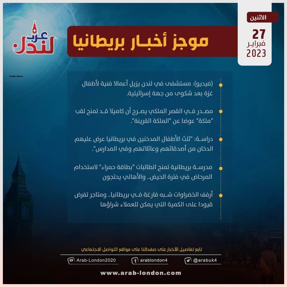 الرئيسية أخبار موجز أخبار بريطانيا: 27 فبراير 2023 أخبار موجز أخبار بريطانيا: 27 فبراير 2023 2023-02-27 (فيديو): مستشفى في لندن يزيل أعمالا فنية لأطفال غزة بعد شكوى من جهة إسرائيلية مصدر في القصر الملكي يصرح أن كاميلا قد تمنح لقب "ملكة" عوضا عن "الملكة القرينة" دراسة: "ثلث الأطفال المدخنين في بريطانيا عرض عليهم الدخان من أصدقائهم وعائلاتهم وفي المدارس" مدرسة بريطانية تمنح الطالبات "بطاقة حمراء" لاستخدام المرحاض في فترة الحيض.. والأهالي يحتجون أرفف الخضراوات شبه فارغة في بريطانيا.. ومتاجر تفرض قيودا على الكمية التي يمكن للعملاء شراؤها السابق فيديو/ بريطانيا في دقيقة: "هذه الحالات التي تسحب فيها الجنسية البريطانية… ولو بعد حين" التالي لعام كامل... مجلس ساوثوارك البلدي يوفر وجبات مجانية لطلاب الثانوية المحتاجين في بريطانيا تابعوا آخر أخبار عرب لندن عبر Google News الاكثر قراءة مساجد بريطانيا تعلن الجمعة أول أيام عيد الفطر 2026-03-18 أمسية حوارية على منصة عرب لندن بعنوان “زلزال قوانين الهجرة البريطانية” 2026-03-14 لندن تدرس فرض رسوم إضافية على سيارات الدفع الرباعي للحد من حوادث الطرق 2026-03-13 هل تحولت السياسة الأمريكية إلى حرب صليبية على إيران بقيادة وزير الدفاع الأمريكي؟ 2026-03-12 وفاتان في بريطانيا بمرض التهاب السحايا: ما هو وما أعراضه وكيف تحمي نفسك؟ 2026-03-17 عاجل| بسبب تبييض جرائم الحرب في السودان.. شبكة "سكاي نيوز" تنهي شراكتها مع الإمارات 2026-03-18 مقالات ذات صلة تفشي التهاب السحايا في كينت: NHS تُلزم الطاقم الطبي بارتداء الكمامات 2026-03-19 ستارمر يتحرك لاحتواء تمرد داخل حزب العمال عبر استثناءات في نظام الهجرة 2026-03-19 زيارة مرتقبة لـالملك تشارلز الثالث إلى واشنطن وسط خلافات مع ترامب بشأن إيران 2026-03-19 موجز أخبار بريطانيا من منصة عرب لندن: الخميس: 18 مارس/آذار 2026 2026-03-19 عاجل: قفزة هائلة في أسعار الغاز العالمية بعد ضربة إيرانية لمنشأة "رأس لفان" القطرية 2026-03-19
