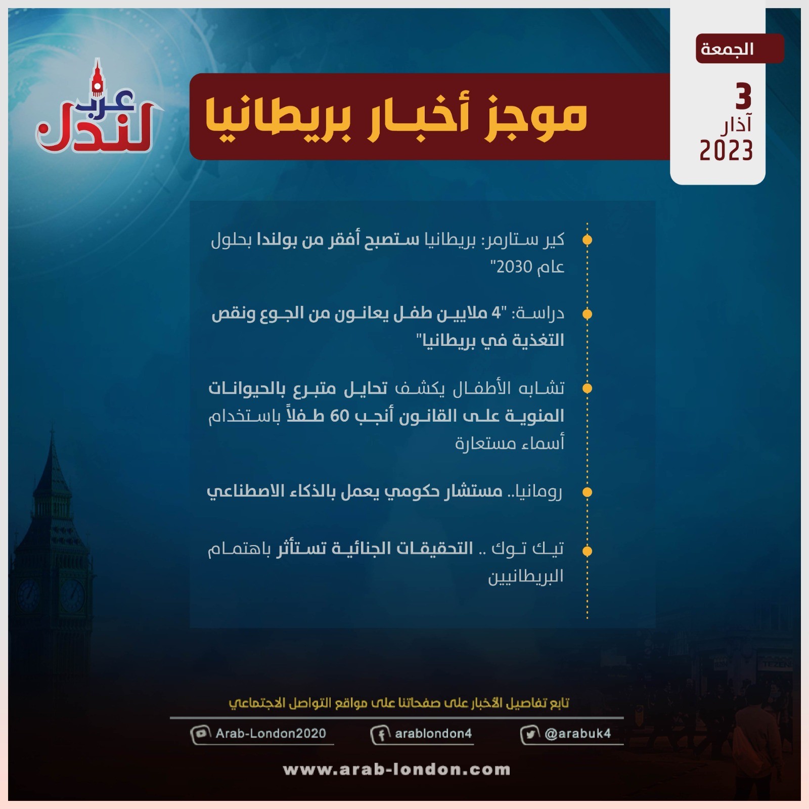 الرئيسية أخبار موجز أخبار بريطانيا: 02 آذار 2023 أخبار موجز أخبار بريطانيا: 02 آذار 2023 2023-03-03 كير ستارمر: بريطانيا ستصبح أفقر من بولندا بحلول عام 2030" دراسة: "4 ملايين طفل يعانون من الجوع ونقص التغذية في بريطانيا" تشابه الأطفال يكشف تحايل متبرع بالحيوانات المنوية على القانون أنجب 60 طفلاً باستخدام أسماء مستعارة رومانيا.. مستشار حكومي يعمل بالذكاء الاصطناعي تيك توك .. التحقيقات الجنائية تستأثر باهتمام البريطانيين السابق عاجل .. فرنسا .. توجيه تهمة الاغتصاب إلى اللاعب المغربي أشرف حكيمي التالي فيديو/ بريطانيا في دقيقة: "أربعة ملايين طفل يعانون الجوع في بريطانيا" تابعوا آخر أخبار عرب لندن عبر Google News الاكثر قراءة مساجد بريطانيا تعلن الجمعة أول أيام عيد الفطر 2026-03-18 أمسية حوارية على منصة عرب لندن بعنوان “زلزال قوانين الهجرة البريطانية” 2026-03-14 لندن تدرس فرض رسوم إضافية على سيارات الدفع الرباعي للحد من حوادث الطرق 2026-03-13 هل تحولت السياسة الأمريكية إلى حرب صليبية على إيران بقيادة وزير الدفاع الأمريكي؟ 2026-03-12 وفاتان في بريطانيا بمرض التهاب السحايا: ما هو وما أعراضه وكيف تحمي نفسك؟ 2026-03-17 عاجل| بسبب تبييض جرائم الحرب في السودان.. شبكة "سكاي نيوز" تنهي شراكتها مع الإمارات 2026-03-18 مقالات ذات صلة تفشي التهاب السحايا في كينت: NHS تُلزم الطاقم الطبي بارتداء الكمامات 2026-03-19 ستارمر يتحرك لاحتواء تمرد داخل حزب العمال عبر استثناءات في نظام الهجرة 2026-03-19 زيارة مرتقبة لـالملك تشارلز الثالث إلى واشنطن وسط خلافات مع ترامب بشأن إيران 2026-03-19 موجز أخبار بريطانيا من منصة عرب لندن: الخميس: 18 مارس/آذار 2026 2026-03-19 عاجل: قفزة هائلة في أسعار الغاز العالمية بعد ضربة إيرانية لمنشأة "رأس لفان" القطرية 2026-03-19