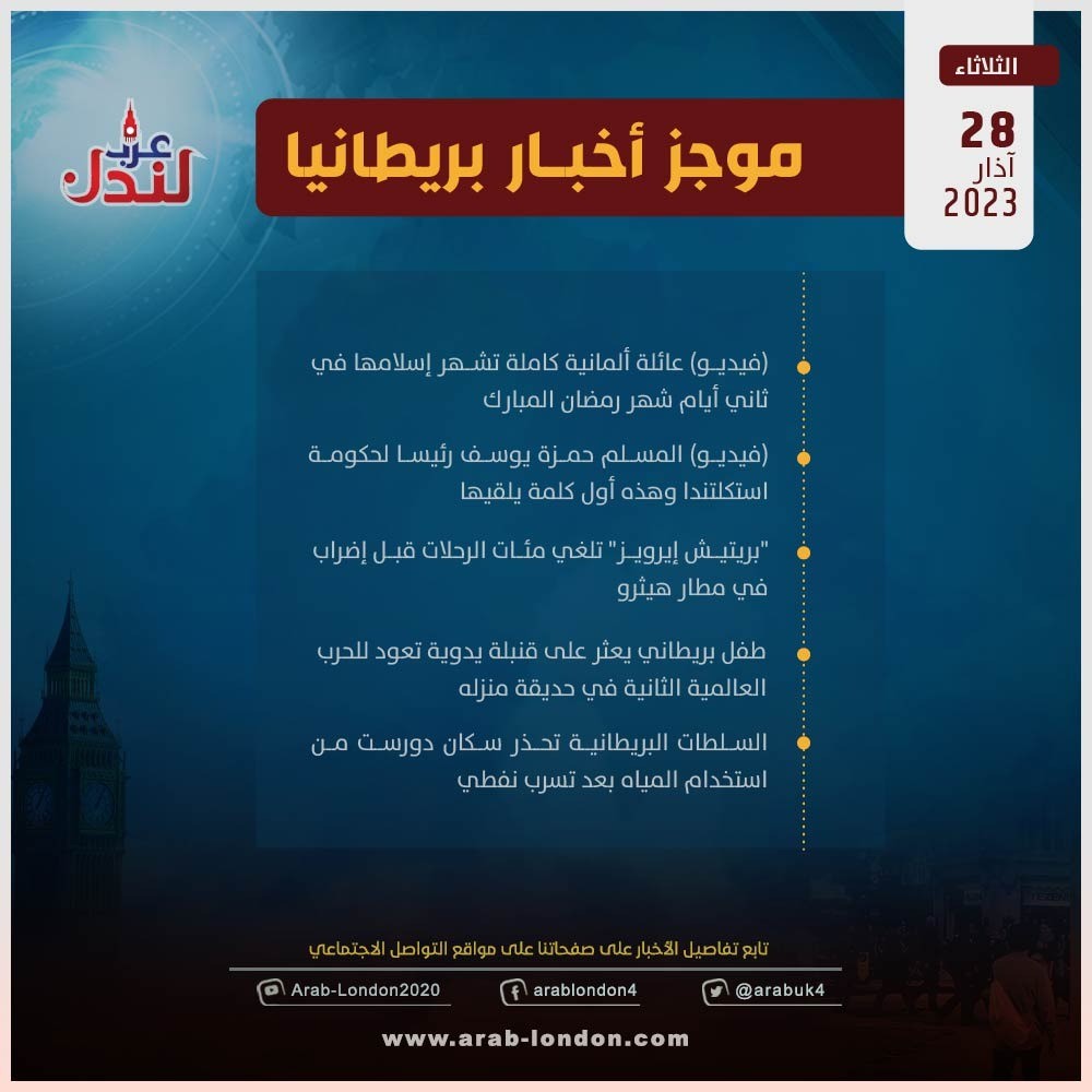 الرئيسية أخبار موجز أخبار بريطانيا: 28 آذار 2023 أخبار موجز أخبار بريطانيا: 28 آذار 2023 2023-03-28 (فيديو) عائلة ألمانية كاملة تشهر إسلامها في ثاني أيام شهر رمضان المبارك (فيديو) المسلم حمزة يوسف رئيسا لحكومة استكلتندا وهذه أول كلمة يلقيها "بريتيش إيرويز" تلغي مئات الرحلات قبل إضراب في مطار هيثرو طفل بريطاني يعثر على قنبلة يدوية تعود للحرب العالمية الثانية في حديقة منزله السلطات البريطانية تحذر سكان دورست من استخدام المياه بعد تسرب نفطي السابق (فيديو) بريطانيا في دقيقة: هندي ومسلم يحكمان بريطانيا … الأقليات تدير بلاد الإنجليز!! التالي فيديو: الأمير هاري في المحكمة للشهادة في قضية ضد صحيفة الديلي ميل.. فما القصة؟ تابعوا آخر أخبار عرب لندن عبر Google News الاكثر قراءة مساجد بريطانيا تعلن الجمعة أول أيام عيد الفطر 2026-03-18 أين تؤدي صلاة عيد الفطر في بريطانيا؟.. إليكم أبرز الأماكن 2026-03-19 أمسية حوارية على منصة عرب لندن بعنوان “زلزال قوانين الهجرة البريطانية” 2026-03-14 لندن تدرس فرض رسوم إضافية على سيارات الدفع الرباعي للحد من حوادث الطرق 2026-03-13 وفاتان في بريطانيا بمرض التهاب السحايا: ما هو وما أعراضه وكيف تحمي نفسك؟ 2026-03-17 عاجل| بسبب تبييض جرائم الحرب في السودان.. شبكة "سكاي نيوز" تنهي شراكتها مع الإمارات 2026-03-18 مقالات ذات صلة عاصفة ثلجية تضرب 9 مدن في بريطانيا 2026-03-20 الخطوط الإسكندنافية أول شركة طيران أوروبية تلغي رحلاتها مع قفزة أسعار الوقود 2026-03-20 تفشي التهاب السحايا في كينت: NHS تُلزم الطاقم الطبي بارتداء الكمامات 2026-03-19 ستارمر يتحرك لاحتواء تمرد داخل حزب العمال عبر استثناءات في نظام الهجرة 2026-03-19 زيارة مرتقبة لـالملك تشارلز الثالث إلى واشنطن وسط خلافات مع ترامب بشأن إيران 2026-03-19