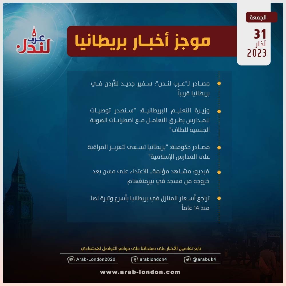 الرئيسية أخبار موجز أخبار بريطانيا: الجمعة 31 آذار 2023 أخبار موجز أخبار بريطانيا: الجمعة 31 آذار 2023 2023-03-31 مصادر لـ"عرب لندن": سفير جديد للأردن في بريطانيا قريباً وزيرة التعليم البريطانية: "سنصدر توصيات للمدارس بطرق التعامل مع اضطرابات الهوية الجنسية للطلاب" مصادر حكومية: "بريطانيا تسعى لتعزيز المراقبة على المدارس الإسلامية" فيديو: مشاهد مؤلمة.. الاعتداء على مسن بعد خروجه من مسجد في بيرمنغهام تراجع أسعار المنازل في بريطانيا بأسرع وتيرة لها منذ 14 عاماً السابق مقتل الطالبة مارتين فيك ماغنوسن.. المشتبه به اليمني يُقرّ لبي بي سي بدور في وفاتها التالي تقرير: "جميع فرق الإطفاء في إنجلترا متهمة بالتمييز العنصري وكراهية النساء ورهاب المثلية" تابعوا آخر أخبار عرب لندن عبر Google News الاكثر قراءة مساجد بريطانيا تعلن الجمعة أول أيام عيد الفطر 2026-03-18 أين تؤدي صلاة عيد الفطر في بريطانيا؟.. إليكم أبرز الأماكن 2026-03-19 أمسية حوارية على منصة عرب لندن بعنوان “زلزال قوانين الهجرة البريطانية” 2026-03-14 لندن تدرس فرض رسوم إضافية على سيارات الدفع الرباعي للحد من حوادث الطرق 2026-03-13 وفاتان في بريطانيا بمرض التهاب السحايا: ما هو وما أعراضه وكيف تحمي نفسك؟ 2026-03-17 عاجل| بسبب تبييض جرائم الحرب في السودان.. شبكة "سكاي نيوز" تنهي شراكتها مع الإمارات 2026-03-18 مقالات ذات صلة عاصفة ثلجية تضرب 9 مدن في بريطانيا 2026-03-20 الخطوط الإسكندنافية أول شركة طيران أوروبية تلغي رحلاتها مع قفزة أسعار الوقود 2026-03-20 تفشي التهاب السحايا في كينت: NHS تُلزم الطاقم الطبي بارتداء الكمامات 2026-03-19 ستارمر يتحرك لاحتواء تمرد داخل حزب العمال عبر استثناءات في نظام الهجرة 2026-03-19 زيارة مرتقبة لـالملك تشارلز الثالث إلى واشنطن وسط خلافات مع ترامب بشأن إيران 2026-03-19