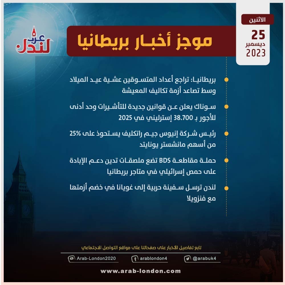 الرئيسية أخبار موجز أخبار بريطانيا من موقع ومنصة عرب لندن/ الاثنين : 25 كانون الأول/ديسمبر 2023 أخبار موجز أخبار بريطانيا من موقع ومنصة عرب لندن/ الاثنين : 25 كانون الأول/ديسمبر 2023 2023-12-25 بريطانيا: تراجع أعداد المتسوقين عشية عيد الميلاد وسط تصاعد أزمة تكاليف المعيشة سوناك يعلن عن قوانين جديدة للتأشيرات وحد أدنى للأجور بـ 38.700 إسترليني في 2025 رئيس شركة إنيوس جيم راتكليف يستحوذ على 25% من أسهم مانشستر يونايتد حملة مقاطعة BDS تضع ملصقات تدين دعم الإبادة على حمص إسرائيلي في متاجر بريطانيا لندن ترسل سفينة حربية إلى غويانا في خضم أزمتها مع فنزويلا السابق مدينة بيت لحم خالية من الفرح "لا سانتا ولا احتفالات" خلال أعياد الميلاد بسبب المذبحة الإسرائيلية في غزة التالي بالفيديو.. محمد أمين: أميركا لن تقبل بخروج إسرائيل منهزمة من حربها على غزة تابعوا آخر أخبار عرب لندن عبر Google News الاكثر قراءة واشنطن تُقيّد تسليم ملفات إبستين وبريطانيا تواجه عوائق قانونية 2026-04-25 شبانة محمود لا تستبعد ترحيل طالبي اللجوء الأفغان المرفوضين 2026-04-25 لندن تستضيف اجتماعاً لأكثر من 30 دولة لبحث أمن مضيق هرمز 2026-04-22 شرطة لندن تنتقد قرار فصل موظف دافع عن متجره ضد عملية سرقة 2026-04-23 لندن تمنع مؤثرة أمريكية متطرفة من دخول أراضيها في خطوة لمنع "خطاب الكراهية" 2026-04-21 خاص لعرب لندن| السوريون في بريطانيا يترقبون مآلات ملفات اللجوء بعد زيارة الشرع 2026-04-21 مقالات ذات صلة موجز أخبار بريطانيا من منصة عرب لندن/ الأحد: 26 أبريل / نيسان 2026 2026-04-27 شرطة لندن تستخدم الذكاء الاصطناعي لكشف الفساد وملاحقة الضباط المخالفين 2026-04-27 إصابة 6 ركاب في عملية إخلاء طارئة لرحلة سويسرية في مطار دلهي 2026-04-27 مخاوف أمنية مع وصول الملك تشارلز إلى واشنطن بعد محاولة اغتيال ترامب 2026-04-27 حكومة بريطانيا تواجه ضغوطاً بشأن تأجيل حظر منصات التواصل الاجتماعي للأطفال 2026-04-27