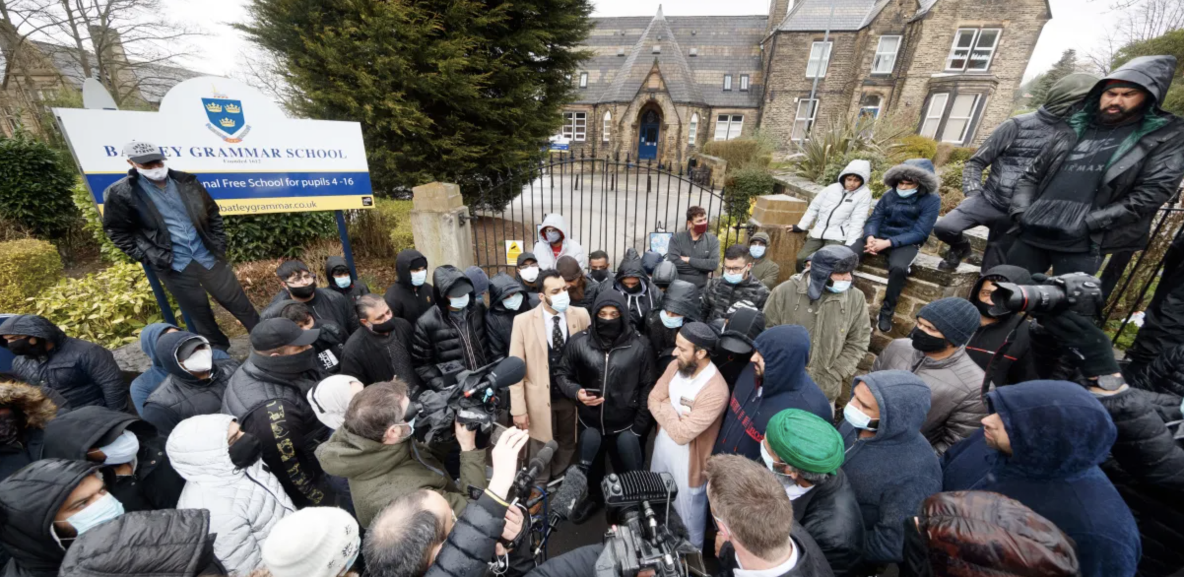 وشهدت مدرسة باتلي غرامر لموجة من التظاهرات بعد أن عُرض على التلاميذ رسم كاريكاتوري للنبي محمد خلال أحد الصفوف، مما أدى إلى مخاوف من سلامتهم. ولا يزال المعلم المعني بالأمر مختبئاً؛ بسبب ما وصفته خان بـ "المضايقات المقيدة للحرية" من قبل المتظاهرين.