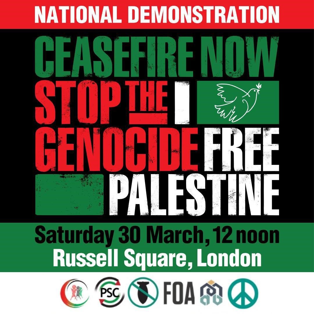 دعت عدة هيئات مدنية مناصرة للقضية الفلسطينية، ببريطانيا، إلى المشاركة، بفعالية وقوة، في المسيرة الحاشدة التي تعتزم تنظيمها، يوم السبت المقبل، 30 مارس 2024، بـ"روسيل سكواير" بالعاصمة البريطانية لندن، دعما للفلسطينيين، ولاسيما في قطاع غزة، حيث يتعرض أزيد من مليوني فلسطيني لحرب إبادة إسرائيلية متواصلة منذ ما يزيد على خمسة أشهر.