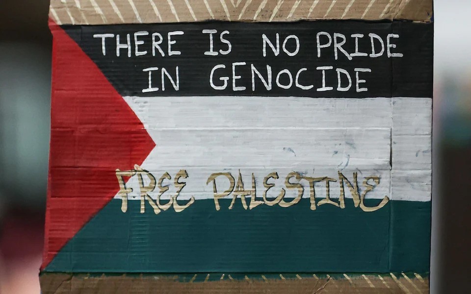 ومع ذلك رفع حوالي 50 ناشطًا مؤيدًا لفلسطين ملصقات تتهم إسرائيل بارتكاب إبادة جماعية وتدين "الغسيل الوردي" - وهو الادعاء بأن الدولة الإسرائيلية تتخذ موقفًا تقدميًا بشأن حقوق المثليين لتحسين سمعتها الدولية.