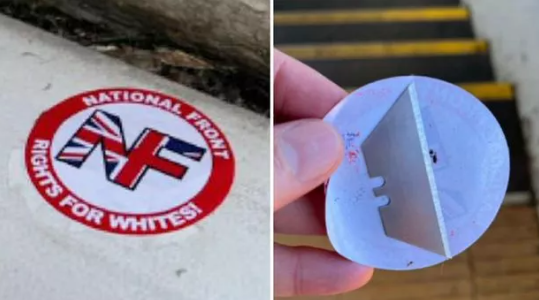 وبحسب صحيفة الميرور "Mirror" عثر أحد الأشخاص على الملصقات، التي تحمل علامة الجبهة الوطنية مع الأحرف الأولى "NF" والشعار "حقوق البيض"، بالقرب من محطة قطار Dunton Green في كينت، حيث تم اكتشاف شفرة حلاقة مخبأة تحتها.