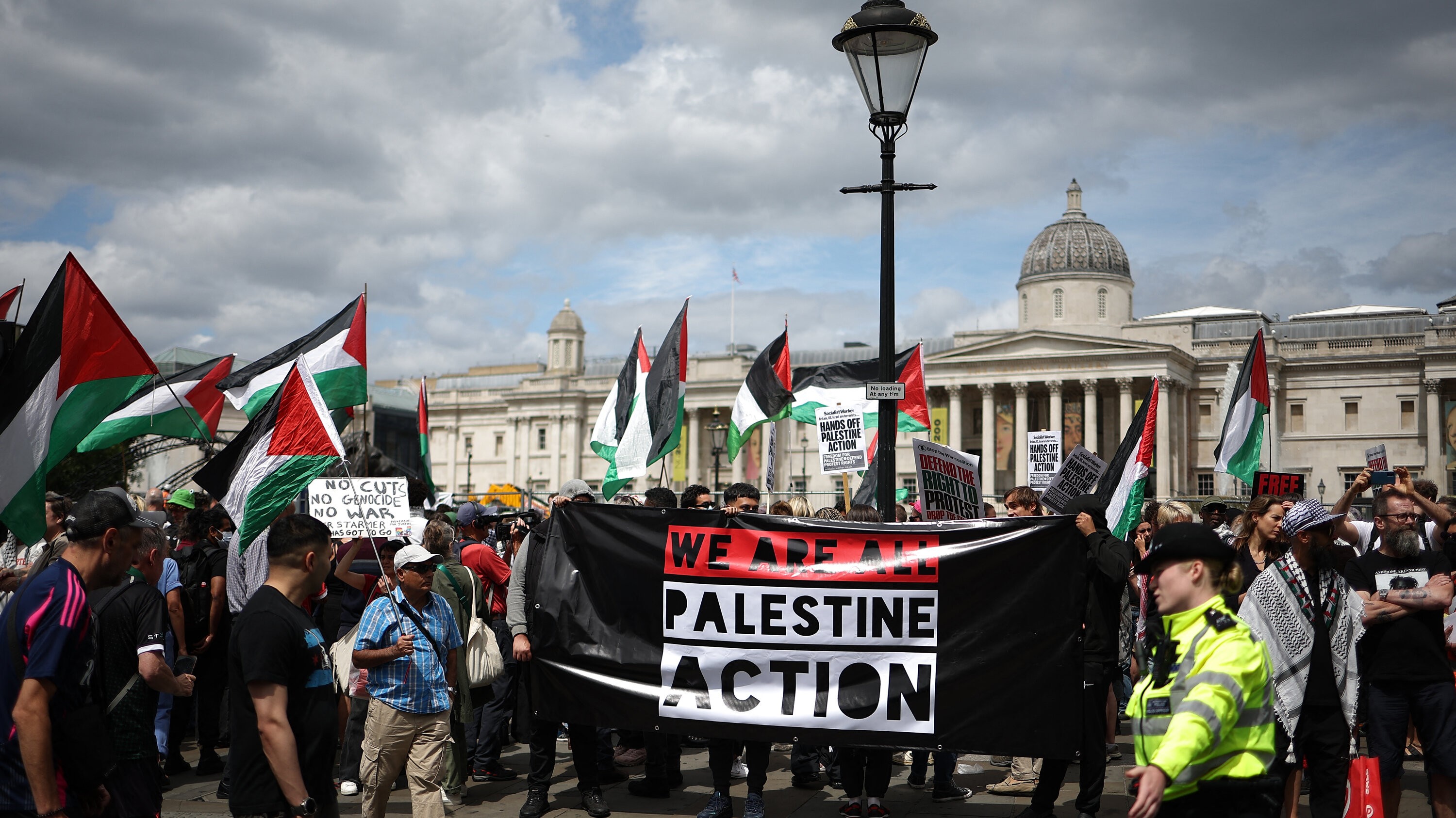 وقد شملت الاعتقالات متظاهرين كانوا يحملون لافتات كتب عليها "ندعم فلسطين أكشن"، في احتجاجات متفرقة بأنحاء البلاد، رافضةً سياسات الحكومة تجاه فلسطين.