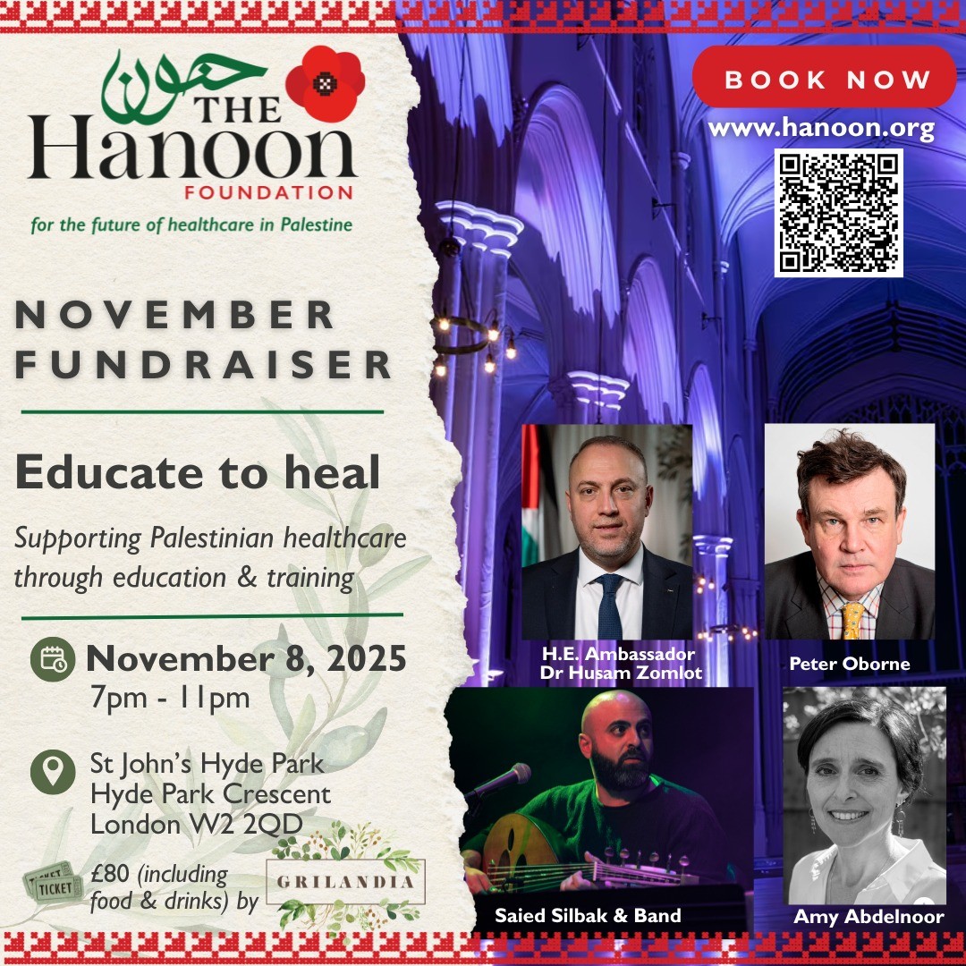 تنظم مؤسسة حنّون (Hanoon Foundation)، وهي منظمة خيرية بريطانية، يوم السبت 8 نوفمبر 2025 في St John’s Hyde Park, Hyde Park Crescent, London, W2 2QD، حفلًا خيريًا بعنوان "Educate to Heal – التعليم للشفاء"، من الساعة السابعة مساءً حتى الحادية عشرة ليلًا، لدعم الطلاب الفلسطينيين في المجال الطبي الذين يواصلون دراستهم في المملكة المتحدة.
