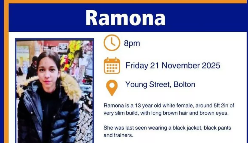 أطلقت شرطة بولتون، التابعة لشرطة مانشستر الكبرى، نداءً عاجلًا للعثور على رامونا، فتاة تبلغ من العمر 13 عامًا، شوهدت آخر مرة يوم الجمعة 21 نوفمبر 2025 في شارع يونغ في بولتون.