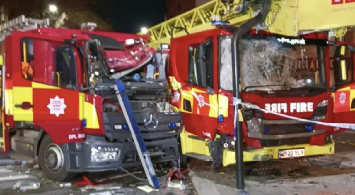 ووقع الحادث مساء السبت عند تقاطع شارعي فارينغدون وكليركنويل، عندما اصطدمت سيارتا إطفاء، إحداهما من محطة لامبيث والأخرى سلّم متحرك من محطة سوهو، ما أدى إلى إصابات شملت كسورًا وإصابات في الصدر والرأس.