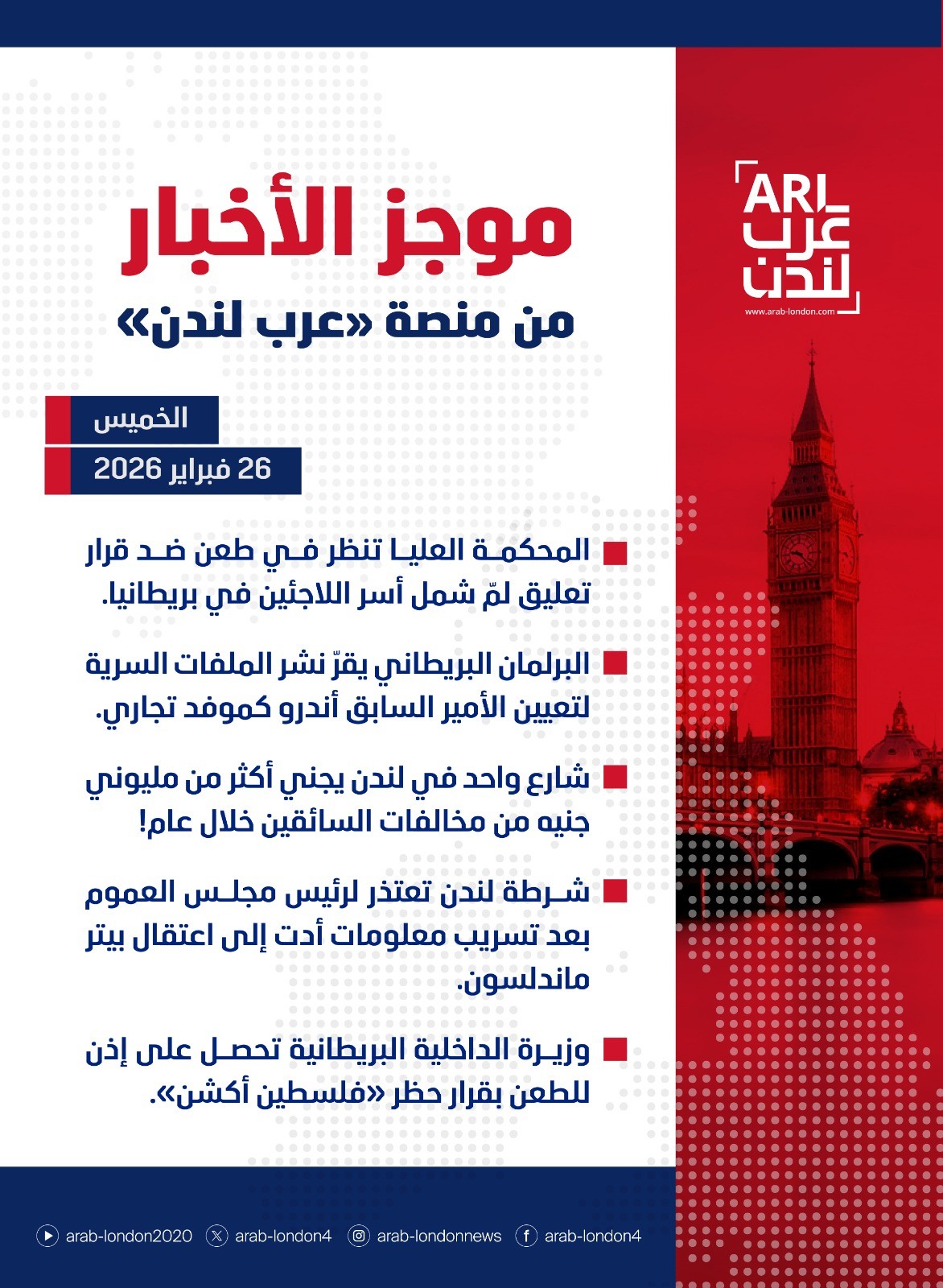 الرئيسية أخبار موجز أخبار بريطانيا من منصة #عرب_لندن: الخميس : 26 فبراير / شباط 2026 أخبار موجز أخبار بريطانيا من منصة #عرب_لندن: الخميس : 26 فبراير / شباط 2026 2026-02-26 🔴المحكمة العليا تنظر في طعن ضد قرار تعليق لمّ شمل أسر اللاجئين في بريطانيا 🔴 البرلمان البريطاني يقرّ نشر الملفات السرية لتعيين الأمير السابق أندرو كموفد تجاري 🔴 شارع واحد في لندن يجني أكثر من مليوني جنيه من مخالفات السائقين خلال عام! 🔴 شرطة لندن تعتذر لرئيس مجلس العموم بعد تسريب معلومات أدت إلى اعتقال بيتر ماندلسون 🔴 وزيرة الداخلية البريطانية تحصل على إذن للطعن بقرار حظر "فلسطين أكشن" السابق الحكومة البريطانية تموّل نصبًا دائمًا لضحايا غرينفيل ال72 التالي وزيرة الداخلية البريطانية تحصل على إذن للطعن بقرار حظر "فلسطين أكشن" تابعوا آخر أخبار عرب لندن عبر Google News الاكثر قراءة اعتقال زوج نائبة بريطانية واثنين آخرين للاشتباه بالتجسس لصالح الصين 2026-03-06 برنامج تجريبي: 40 ألف جنيه إسترليني لتشجيع عائلات طالبي اللجوء المرفوضة على مغادرة بريطانيا 2026-03-05 تحقيق يكشف تورط 22 متهماً في مؤامرة طرود مفخخة استهدفت بريطانيا وأوروبا بدعم روسي 2026-03-06 بريطانيا تقرّ إجراءات مشددة: السماح لآلاف اللاجئين بالعمل مقابل رفع الدعم الحكومي 2026-03-05 بعد العثور على 600 قطعة سلاح.. إدانة بريطاني مهووس بالنازية بتهم إرهابية 2026-03-06 عاجل/ اعتقال 10 أشخاص بينهم بريطانيون للاشتباه في تجسسهم لصالح إيران في لندن 2026-03-06 مقالات ذات صلة إجلاء أكثر من 100 شخص بعد انهيار رافعة في غرب لندن 2026-03-06 استجواب ثلاث مشتبهات في تحقيقات الاعتداءات الجنسية المرتبطة بمحمد الفايد 2026-03-06 اتهامات لوزيرة الداخلية بتقليد سياسات ترامب المتشددة تجاه اللاجئين 2026-03-06 تحقيق يكشف تورط 22 متهماً في مؤامرة طرود مفخخة استهدفت بريطانيا وأوروبا بدعم روسي 2026-03-06 وزير أيرلندي يندد بالإساءة لعمال محطات الوقود بسبب ارتفاع الأسعار 2026-03-06