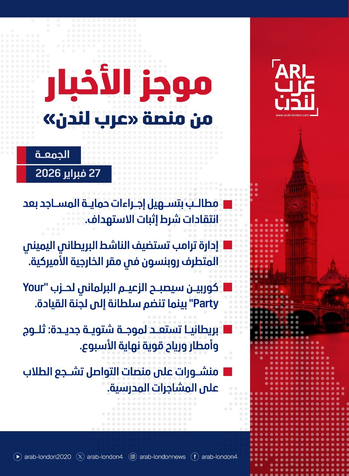 الرئيسية أخبار موجز أخبار بريطانيا من منصة عرب لندن: الجمعة : 27 فبراير / شباط 2026 أخبار موجز أخبار بريطانيا من منصة عرب لندن: الجمعة : 27 فبراير / شباط 2026 2026-02-27 🔴مطالب بتسهيل إجراءات حماية المساجد بعد انتقادات شرط إثبات الاستهداف 🔴إدارة ترامب تستضيف الناشط البريطاني اليميني المتطرف روبنسون في مقر الخارجية الأميركي 🔴كوربين سيصبح الزعيم البرلماني لحزب "Your Party" بينما تنضم سلطانة إلى لجنة القيادة 🔴بريطانيا تستعد لموجة شتوية جديدة: ثلوج وأمطار ورياح قوية نهاية الأسبوع 🔴منشورات على منصات التواصل تشجع الطلاب على المشاجرات المدرسية السابق الخضر ينتزعون مقعداً جديداً في مانشستر ويوجهون ضربة سياسية للعمال والإصلاح التالي بريطانيا: سيدة ورضيعها كادوا يموتون بعد تأجيل ولادتها القيصرية في عطلة نهاية الأسبوع تابعوا آخر أخبار عرب لندن عبر Google News الاكثر قراءة اعتقال زوج نائبة بريطانية واثنين آخرين للاشتباه بالتجسس لصالح الصين 2026-03-06 برنامج تجريبي: 40 ألف جنيه إسترليني لتشجيع عائلات طالبي اللجوء المرفوضة على مغادرة بريطانيا 2026-03-05 تحقيق يكشف تورط 22 متهماً في مؤامرة طرود مفخخة استهدفت بريطانيا وأوروبا بدعم روسي 2026-03-06 بريطانيا تقرّ إجراءات مشددة: السماح لآلاف اللاجئين بالعمل مقابل رفع الدعم الحكومي 2026-03-05 بعد العثور على 600 قطعة سلاح.. إدانة بريطاني مهووس بالنازية بتهم إرهابية 2026-03-06 عاجل/ اعتقال 10 أشخاص بينهم بريطانيون للاشتباه في تجسسهم لصالح إيران في لندن 2026-03-06 مقالات ذات صلة إجلاء أكثر من 100 شخص بعد انهيار رافعة في غرب لندن 2026-03-06 استجواب ثلاث مشتبهات في تحقيقات الاعتداءات الجنسية المرتبطة بمحمد الفايد 2026-03-06 اتهامات لوزيرة الداخلية بتقليد سياسات ترامب المتشددة تجاه اللاجئين 2026-03-06 تحقيق يكشف تورط 22 متهماً في مؤامرة طرود مفخخة استهدفت بريطانيا وأوروبا بدعم روسي 2026-03-06 وزير أيرلندي يندد بالإساءة لعمال محطات الوقود بسبب ارتفاع الأسعار 2026-03-06